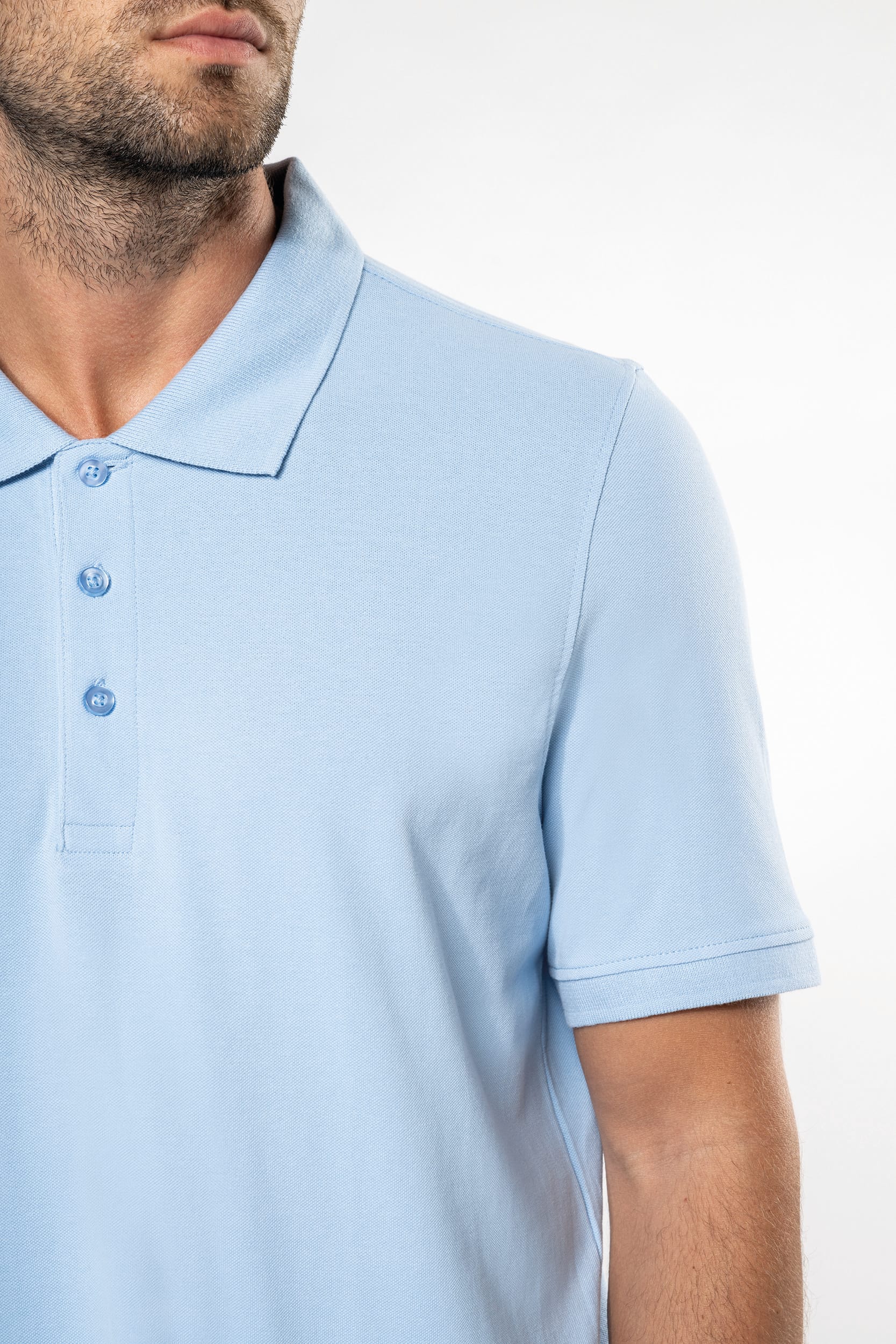 - Cuello con tres botones, canalé en cuello y mangas y sin abertura lateral.